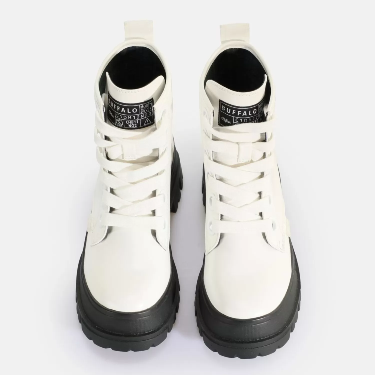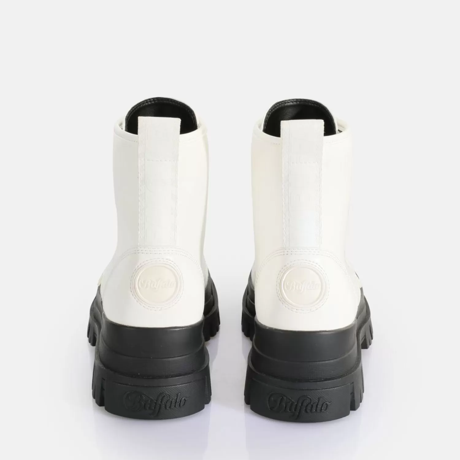With A Stylish White Hue, The Aspha Laceup Hi Ankle Boot Creates An Exceptional Contrast With The Black Outsole. The Model With The Iconic Buffalo Trademark And Perfect Fit Thanks To Its Memory Foam Is Ideal For All Fashionistas Who Are Looking For The Perfect Match To Their Outfit. Comfort Is Provided By The Removable Foam Footbed And The Roadworthy Upper Material, Which Is Of Course Animal-Free And Vegan. Features: Comfortable, Removable Insole Perfect Fit Thanks To Memory Foam Peta-Approved Vegan