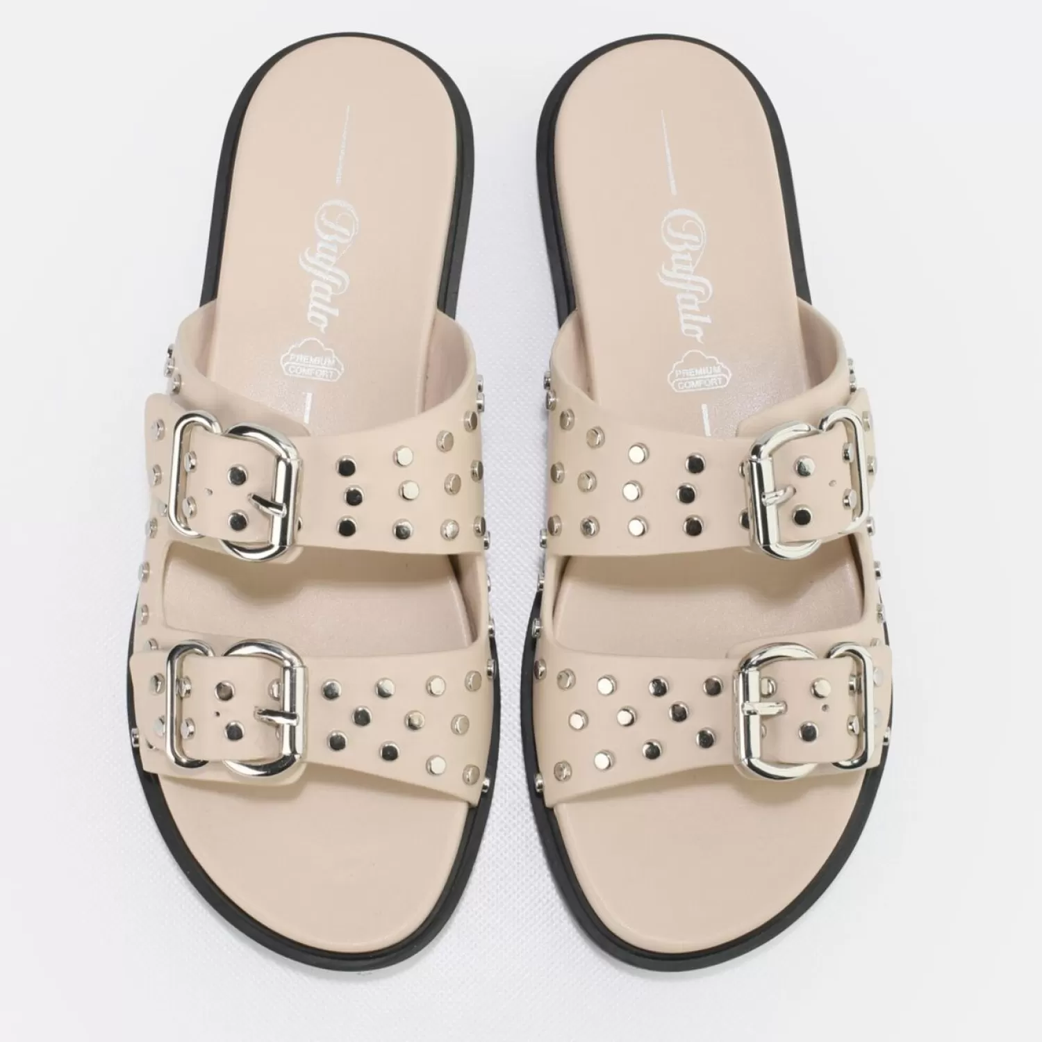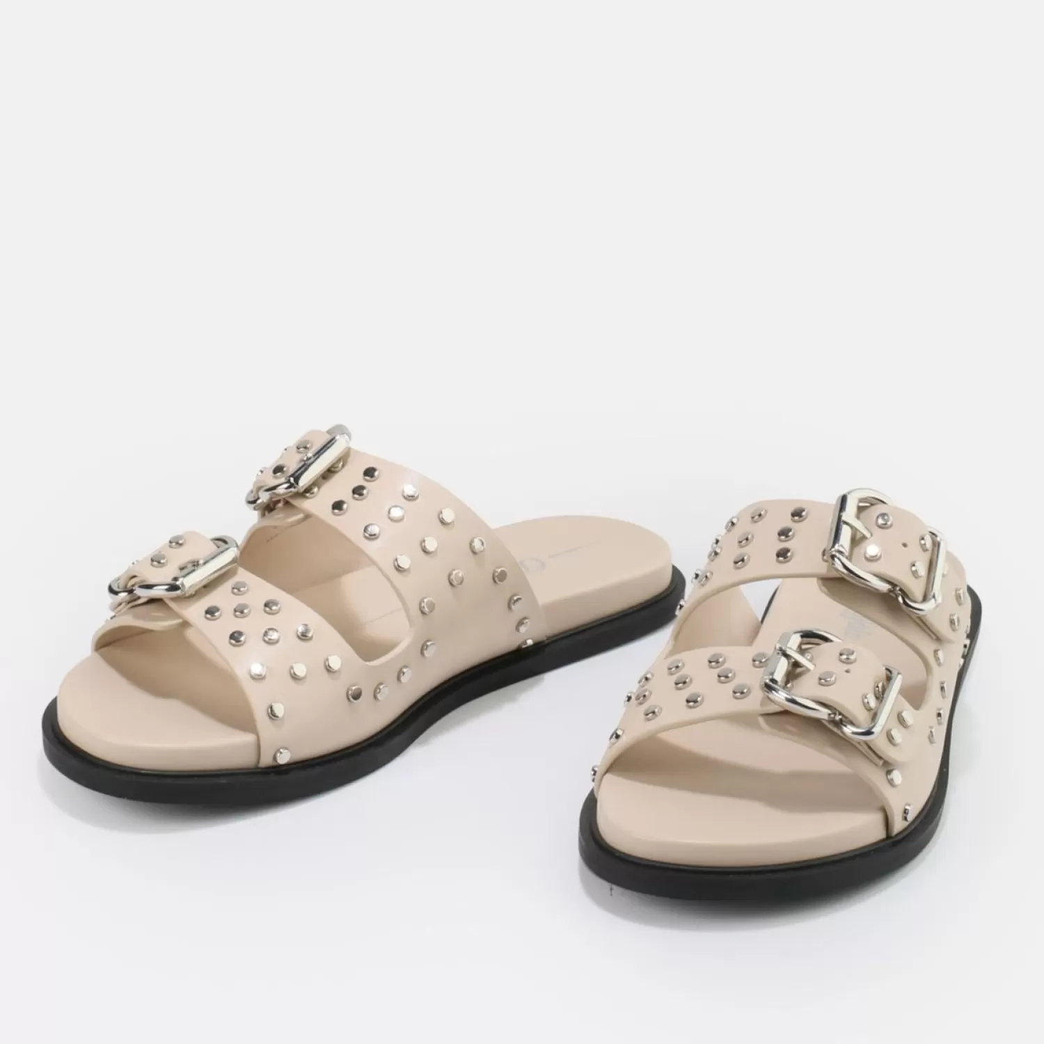 Cream Is Totally Cool! A Little More Subtle In Design, The Blake Belle Slip-On Sandals Create A Great Look For Aneutral Outfit. The Silver Buckles And Rivets Stand Out Even More And Ensure A Cool Appearance. Also The Black Sole Is A Cool Eye-Catcher. Features: Water-Based Materials Wide Strap Construction With Large Buckles And Rivets Beige Nappa Leather Look Peta-Certified Vegan