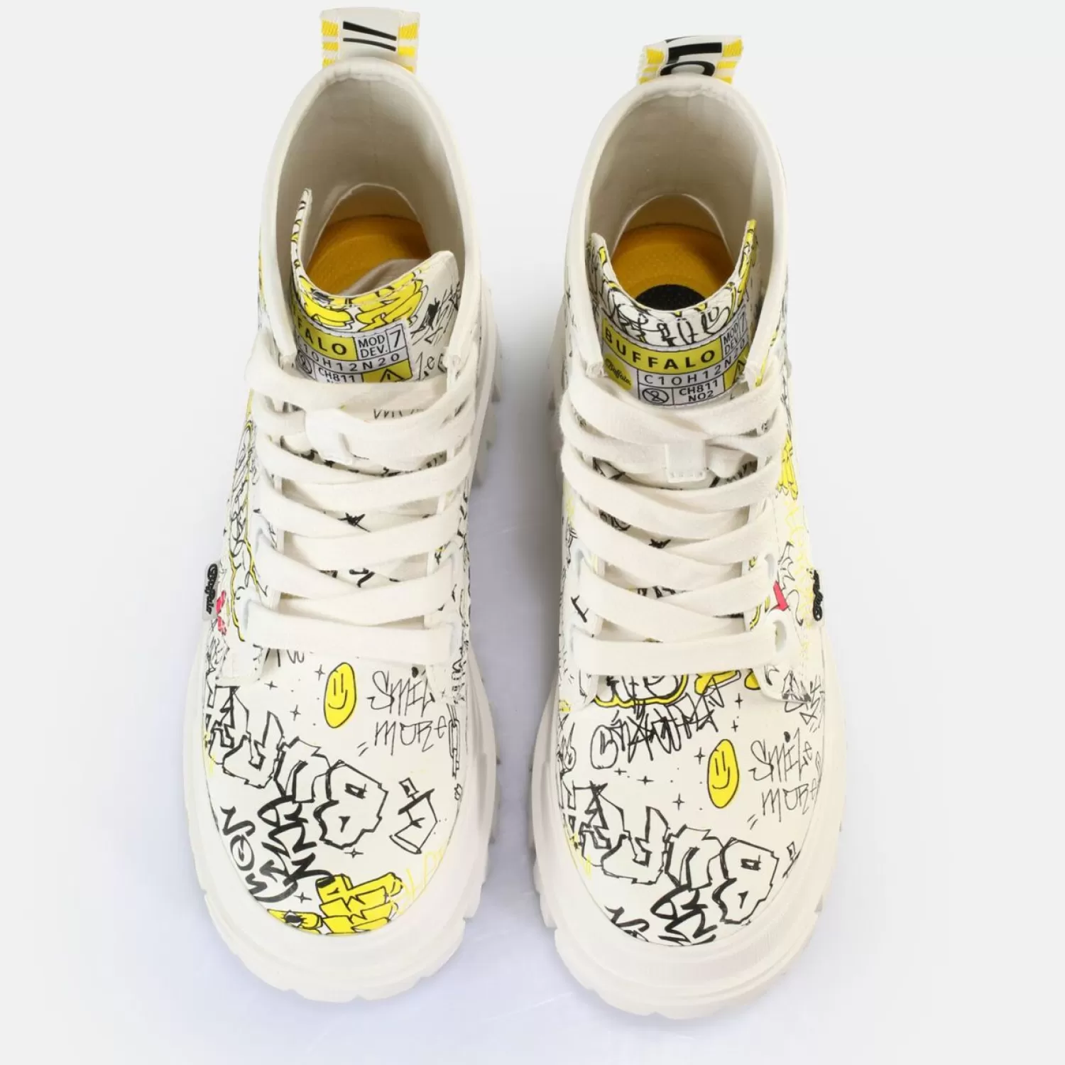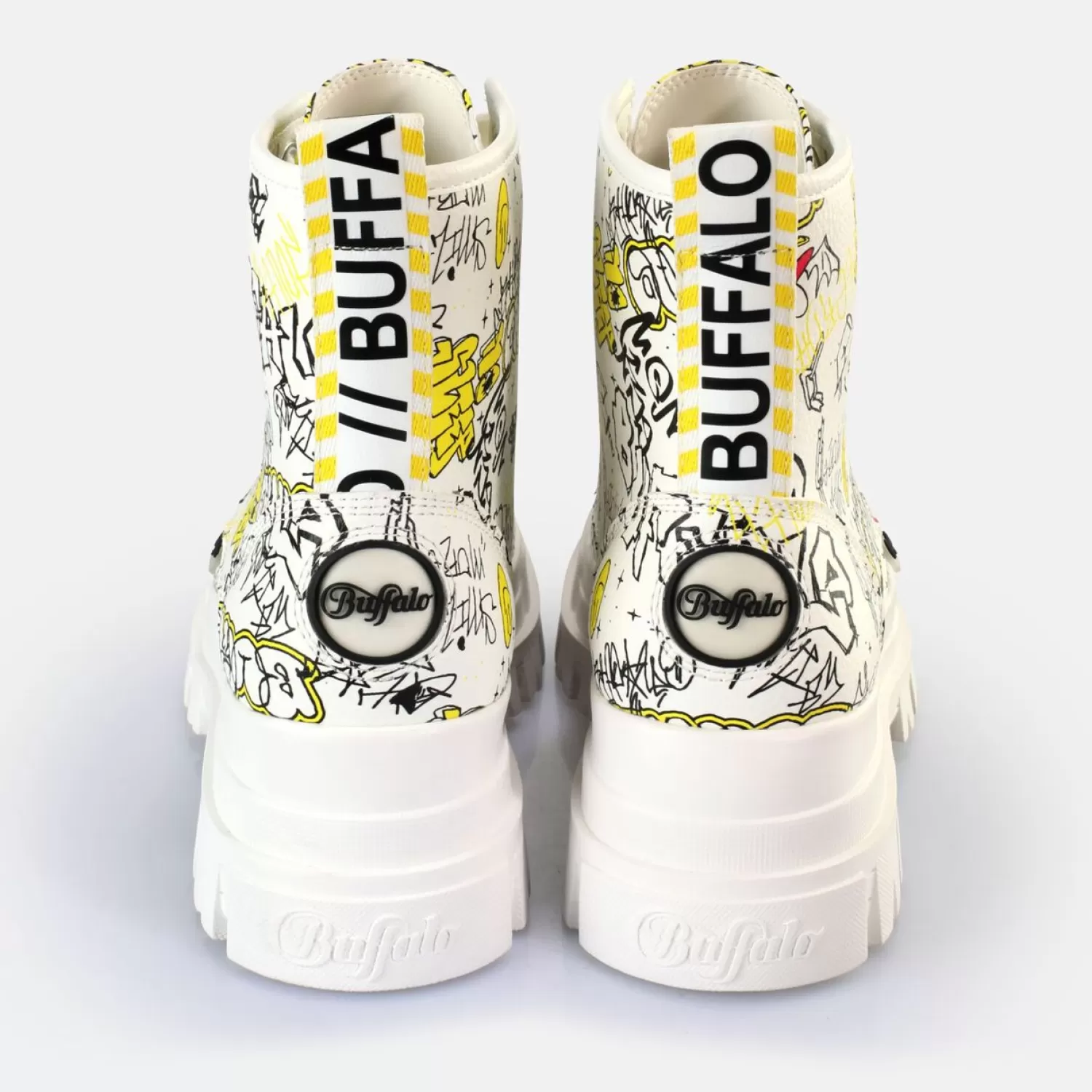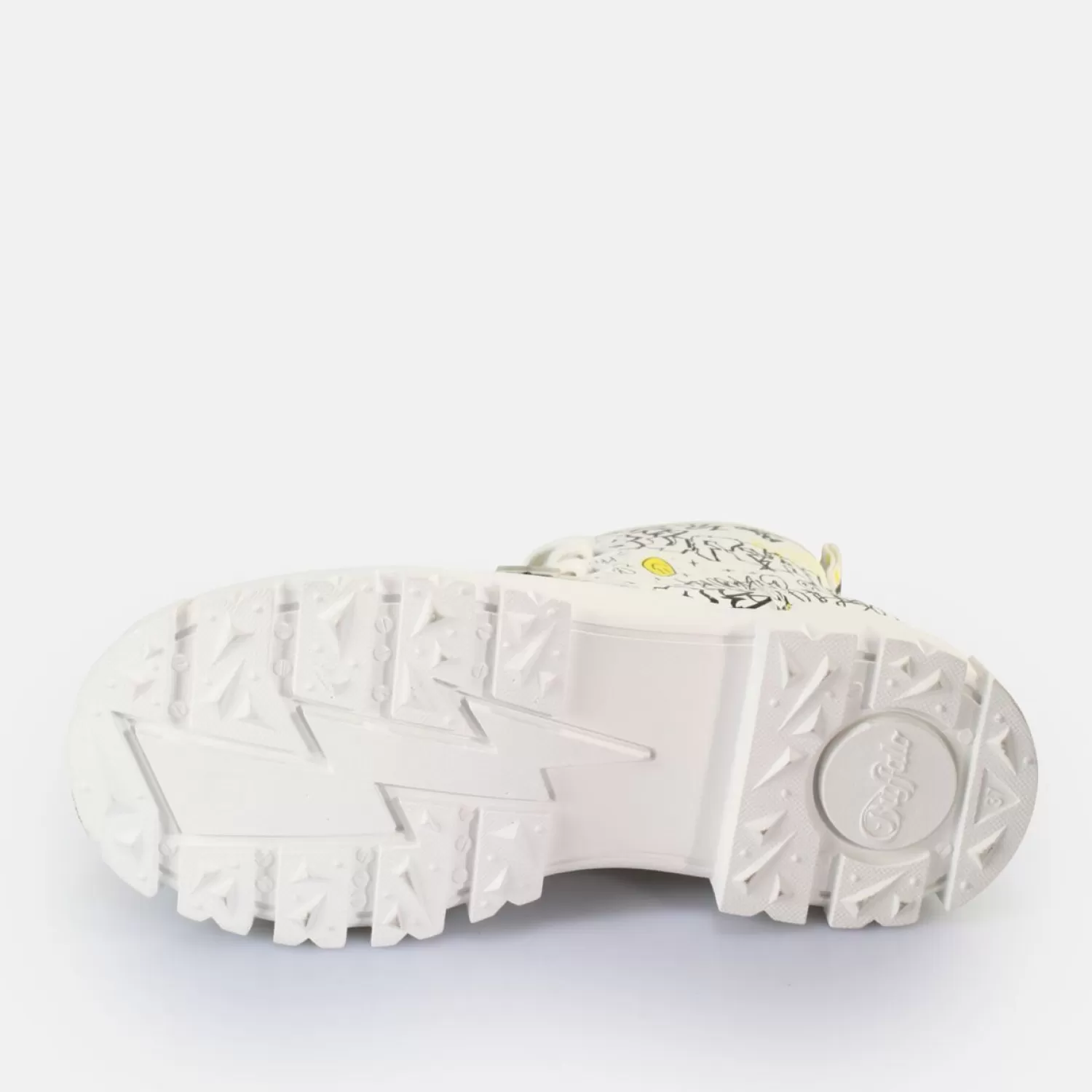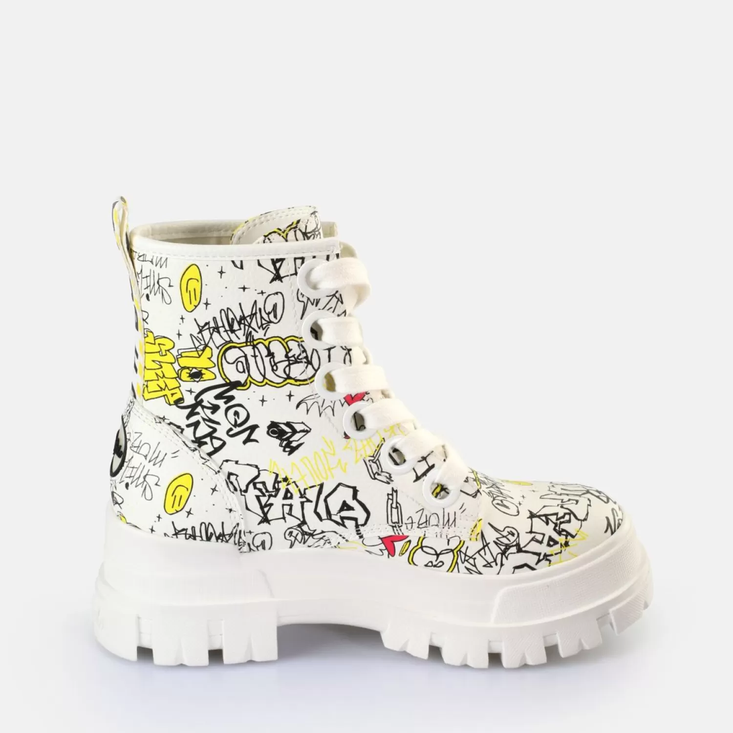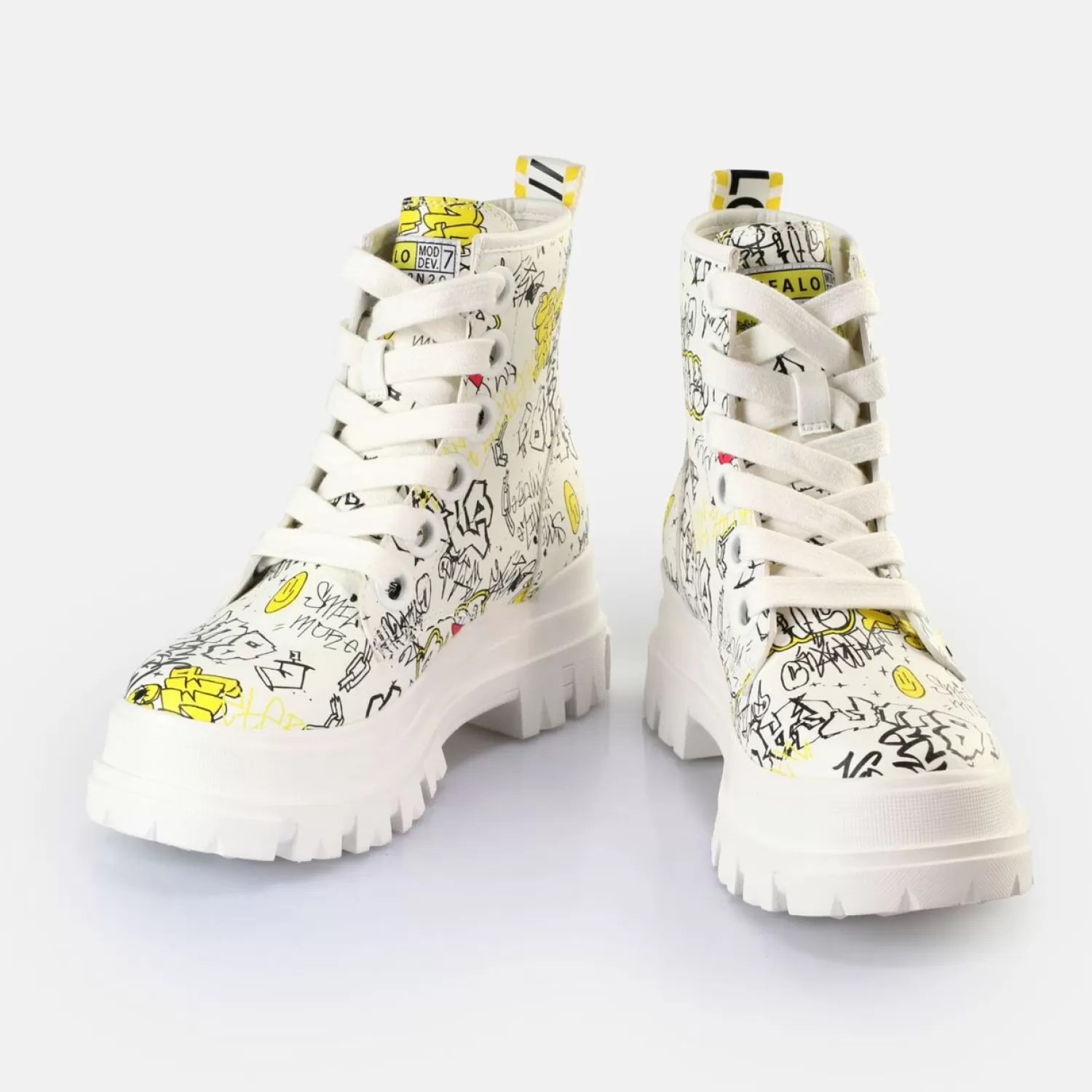 Fancy A New Style? The Vegan Aspha Lace Up Hi Ankle Boot Adds A Colourful Highlight To Your Outfit. The Stylish Graffiti Design On A White Background Provides A Cool And Unique Look. In Addition To The Unique Design, These Boots Have Practical Laces Plus A Removable Memory Foam Sole. The Profiled Platform Sole Ensures You Feel Like You Are Walking On Clouds. Features: Vegan Boots In Faux Nappa Leatherremovable Footbed Memory Foam Sole