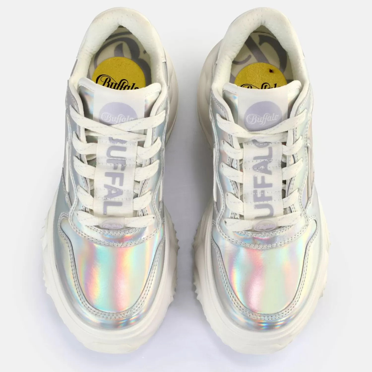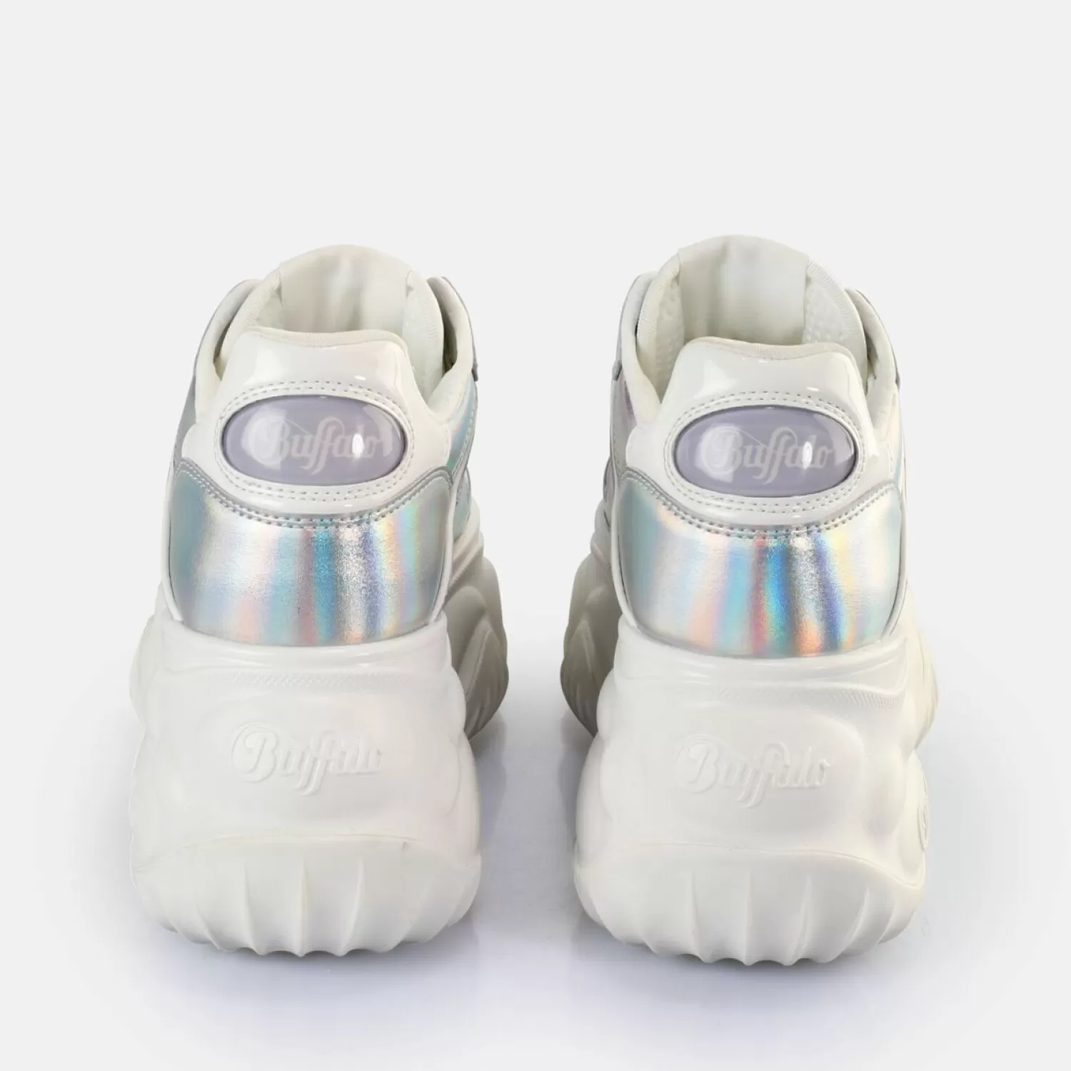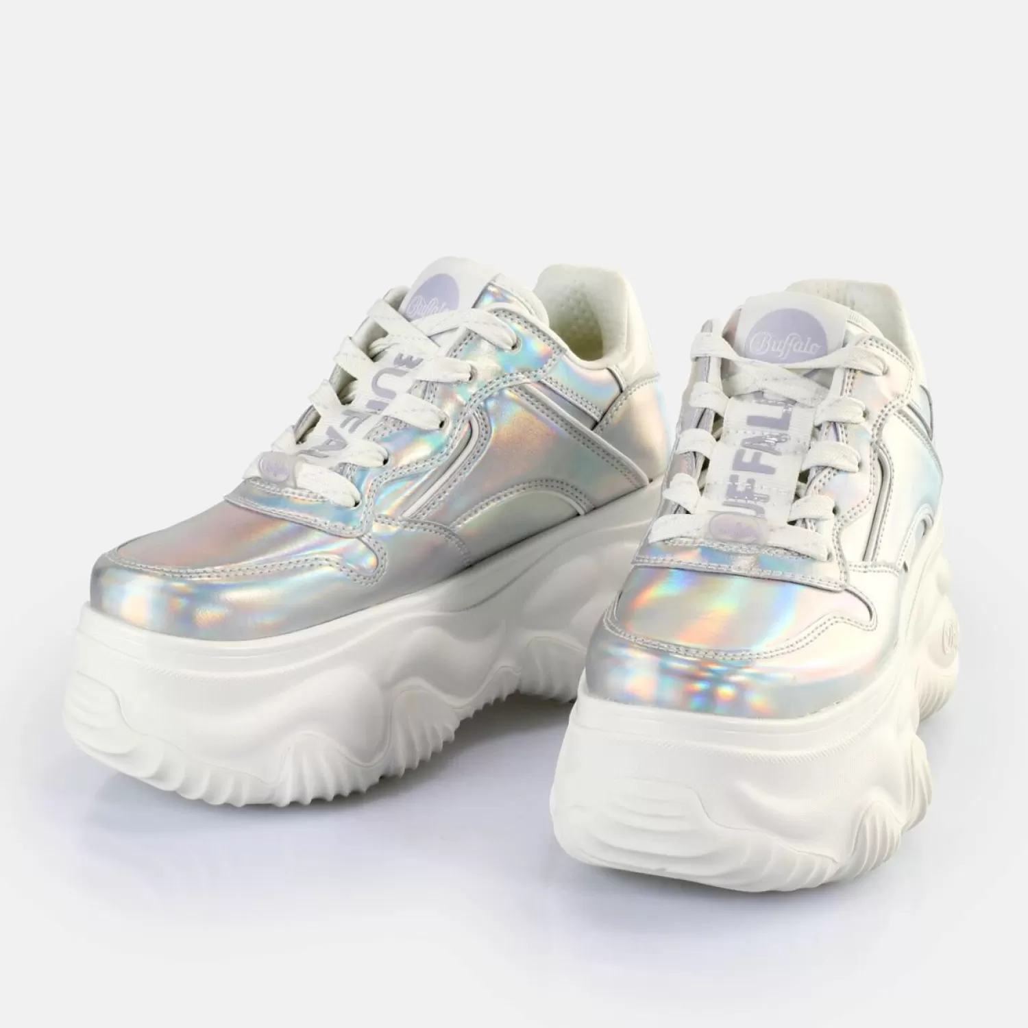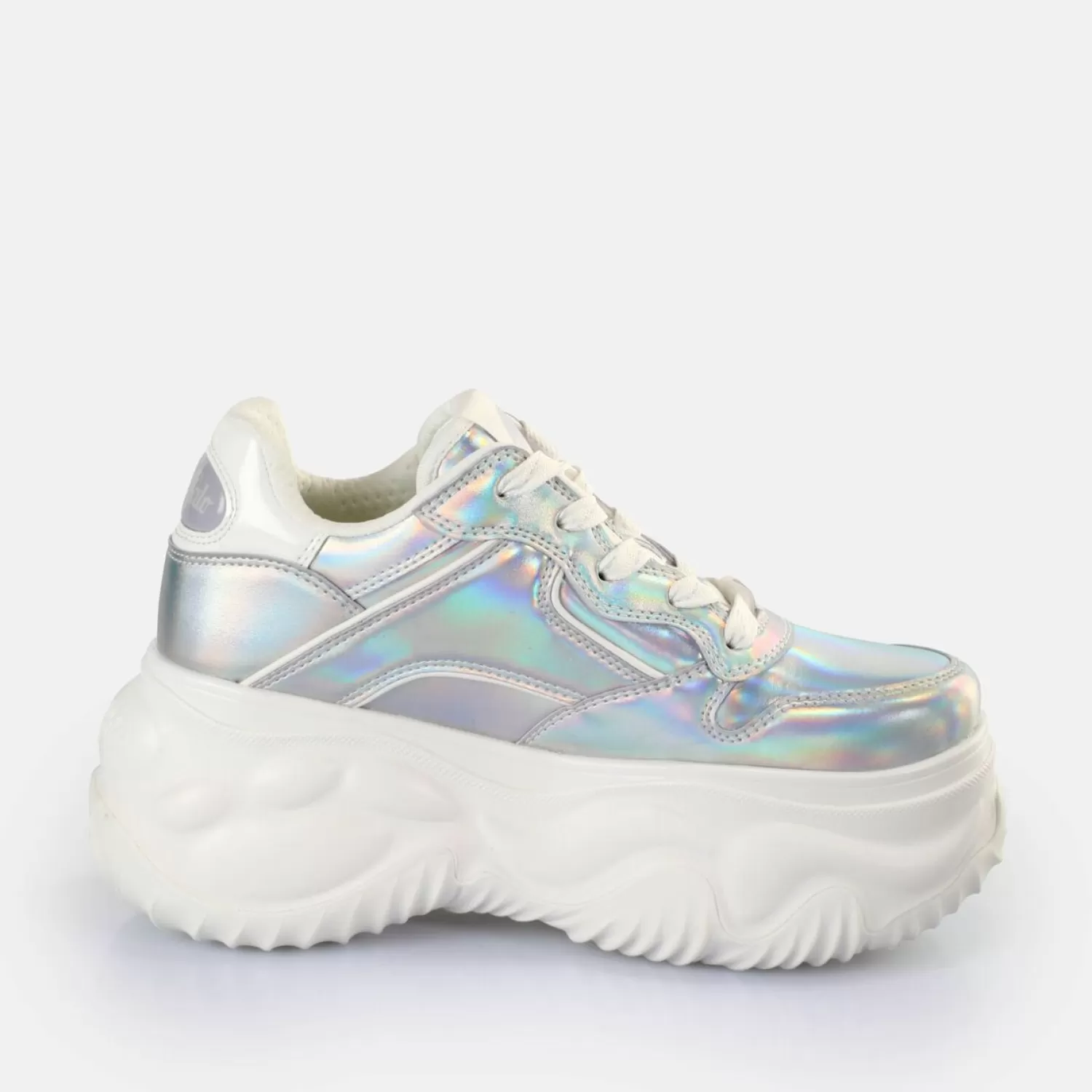 Experience A Unique Style. The Vegan Blader One Sneakers Low Come In An Inimitable Silver Holographic Design That Is Really Eye-Catching. The Ultra-High Platform Sole Also Makes For A Chunky Look That Packs A Punch. Show Everyone That You Have Natural Sense Of Style With These Sneakers. They Also Come With A Removable Memory Foam Insole. Make Any Look A Highlight With This Dazzling And Highly Fashionable Footwear. Features: Vegan Nappa Leather Look In Shimmering Silver7Cm Plateu Height Memory Foam Sole Removable Footbed